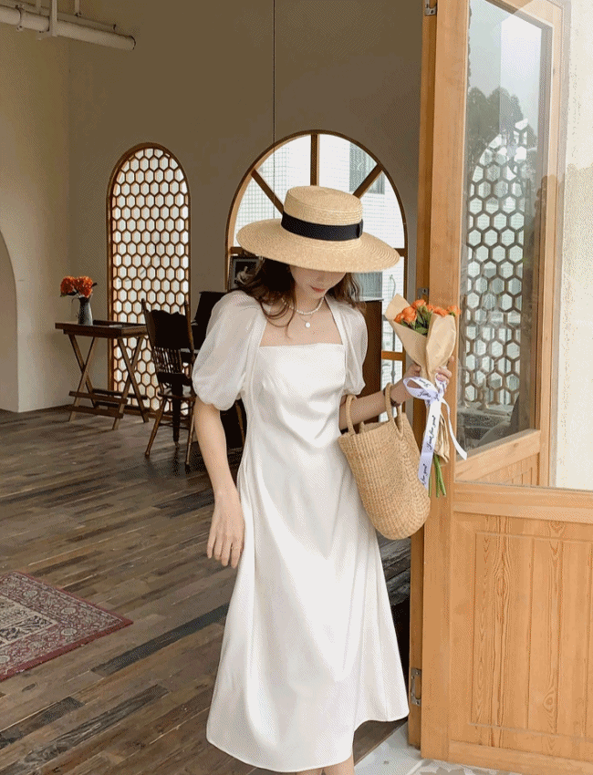 [브라이덜샤워/셀프웨딩/여신드레스] 퍼프원피스 우아한 화이트 블랙 롱드레스 쉬폰원피스 a라인 허리잘록 허리 슬림원피스 하트넥 블라우스 체형커버 플레어원피스 섹시원피스