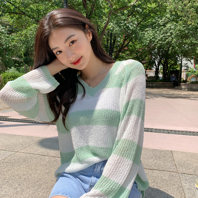 스트라이프 패턴의 루즈핏 V넥 하찌 니트 nt3579