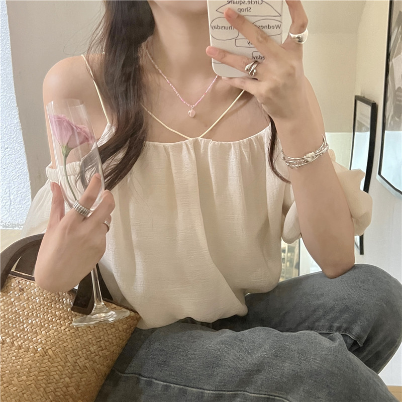 오프숄더 블라우스 쉬폰 셔링 여름 프렌치 반팔 끈나시 여리핏 날씬핏 루즈핏 페미닌 우아한 데일리룩 여친룩 데이트룩 피크닉룩 소개팅룩