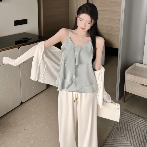 [S당일배송/하객룩/코디세트/여름신상] 에메랄드 그레이 레이어드 와이드 프릴 쉬폰 루즈핏 슬리브리스 끈나시 블라우스 하이웨스트 와이드팬츠 바지 여름 얇은 가디건 셋업 투피스 쓰리피스 세트 봄신상 데이트룩 여친룩 상견례 하객코디 결혼식 데일리 피크닉