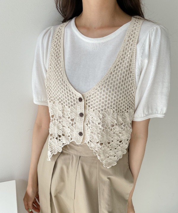 히피룩 뉴히피룩 내츄럴 플라워 뜨개 단추 크롭 뷔스티에 얇은 여름 니트 조끼 베스트 여자