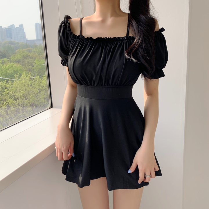 블랙 오프숄더 노출없는 원피스 타입 수영복 (속바지 있음)
