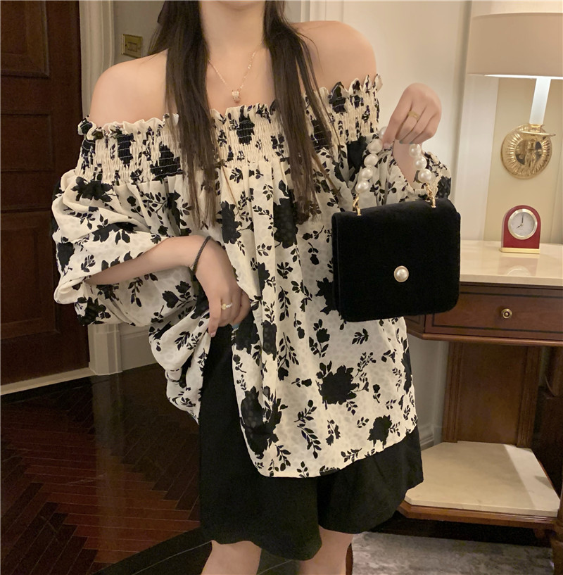 [그린/블랙] 공항패션 공항룩 루즈핏 밴딩 플라워 블라우스