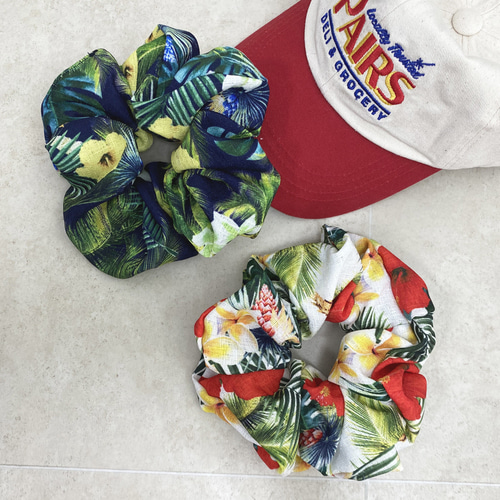 [2컬러] 린넨 면 하와이안 트로피컬 플라워 왕곱창 빅곱창 스크런치 헤어 곱창 머리끈 (아이보리 네이비)