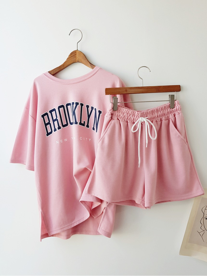(예쁜컬러/데일리SET) 브루클린 레터링 프린트 루즈핏 반팔 티셔츠+밴딩 숏팬츠 반바지 상하 투피스 썸머 트레이닝복 데일리 꾸안꾸 여름 홈웨어 잠옷 추리닝 세트