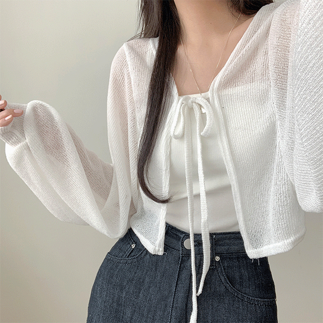 [MOMENT JOY/국내제작/사계절] 파우더 허그미 리본 볼레로 시스루 부클 브이넥 긴팔 크롭 니트 가디건 5color