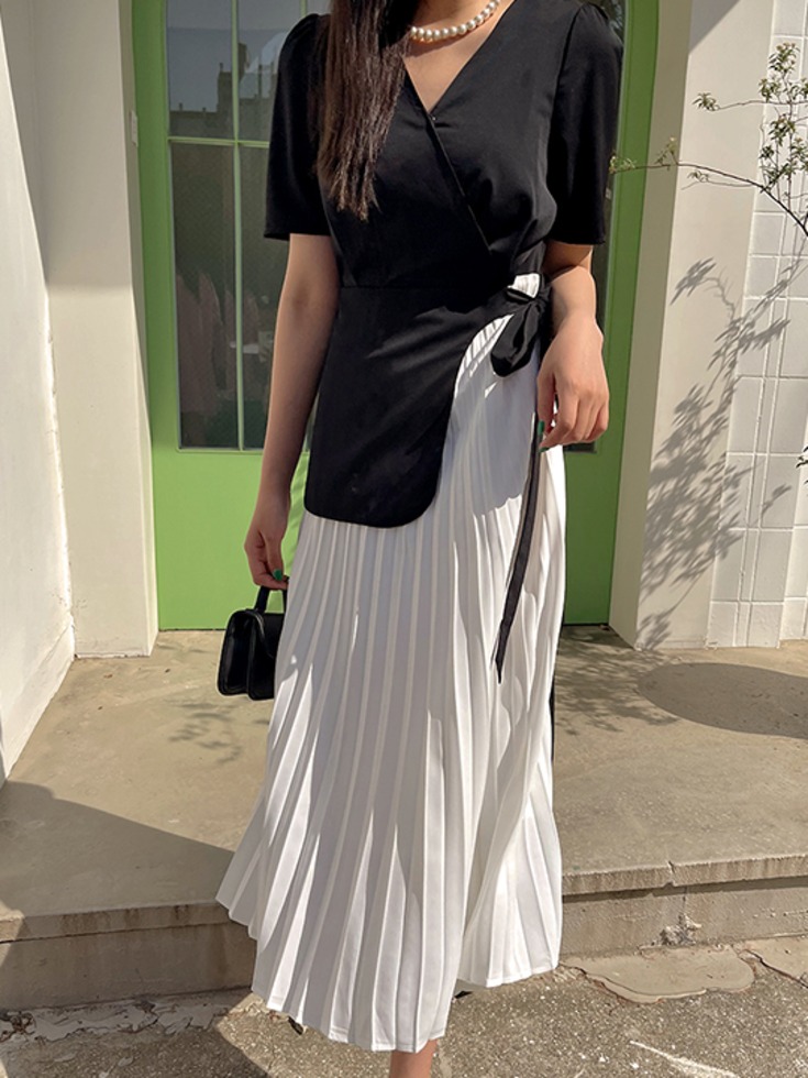 [44-120] 로듀넌 배색 플리츠 랩스타일 롱 원피스( 여름-하객룩-격식룩-데이트룩-데일리룩-출근룩-빅사이즈-120사이즈-자체제작-플리츠-배색-랩스타일-랩원피스-여름하객룩 )