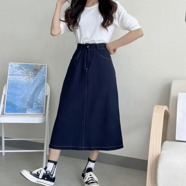 진스 린넨 코튼 뒷밴딩 롱스커트 /밴딩스커트/데님스커트/생지스커트/코튼스커트/핀턱스커트/봄치마/여름스커트/플레어스커트/린넨스커트/출근룩/데이트/