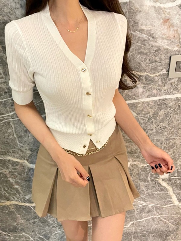 골드링 금장 버클 단추 골지 슬림핏 브이넥 니트 5부 반팔 가디건 (수입) / 2color