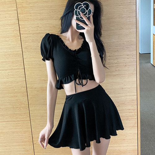 [퀸페이지] 블랙 반팔 셔링 커버 프릴 비키니 비치웨어 스윔웨어 호캉스 수영장 비치룩