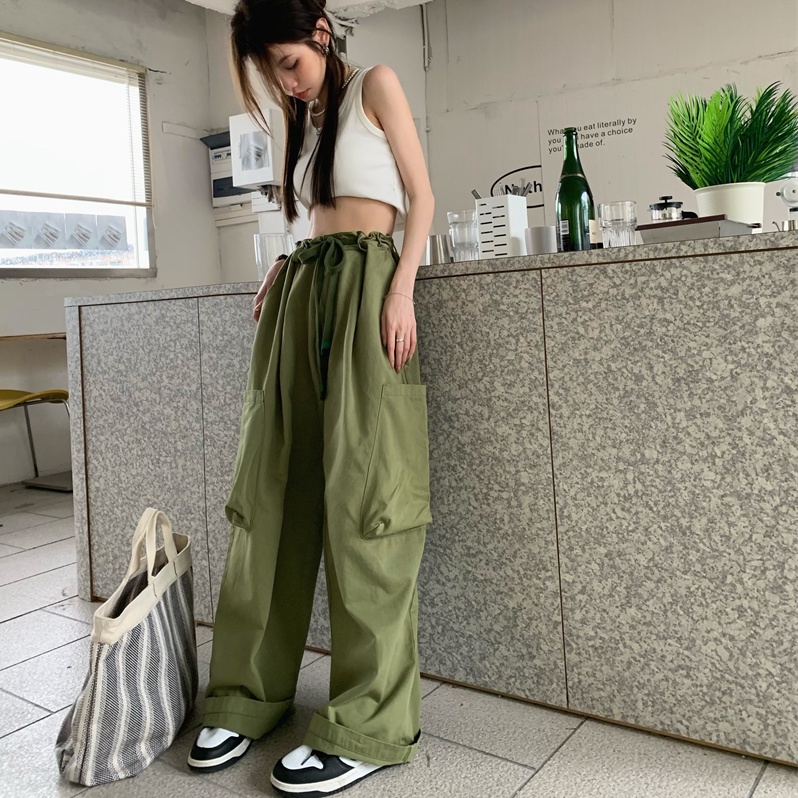 여름 카키 와이드 옆 포켓 하이웨이스트 스트링 끈 뒷밴딩 바스락 로우라이즈 힙한 걸 캐주얼 일자핏 카고 팬츠 바지 / 유니크 스트릿룩 밀리터리룩 코디