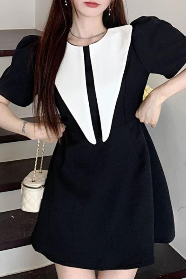 데비 블랙앤 화이트 뾰족 옷깃 버블 반팔 미니 정장 원피스