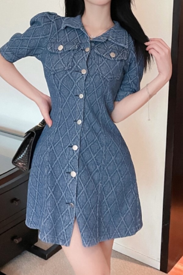 이트 폴로 카라 브이넥 버블 반팔 데님 미니 원피스