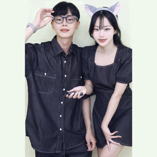 ෆ퍼프소매/러블리ෆ Endearing 데님 원피스 시밀러 (2color) #1573 청원피스 미니 반팔 여름 얇은 시원한 청청 숏 짧은 치마 랩 스커트 청자켓 셔츠 커플 시밀러 데이트