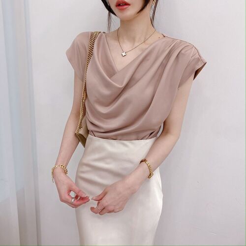 🚀아이오늘출발 [4color] 오프 실켓 언발 드레이프 셔링 민소매 티셔츠 입술넥 블라우스