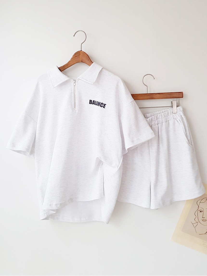 Balance SET/ 심플 레터링 프린트 카라넥 반집업 아노락 루즈핏 코튼 면 반팔 티셔츠+밴딩 반바지 숏팬츠 여름 트레이닝복 데일리 꾸안꾸 추리닝 체육복 운동복 캐주얼 세트