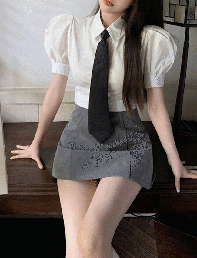 [코스프레/교복세트/롯데월드] 화이트 반팔블라우스 교복셔츠 퍼프 크롭셔츠 핀턱스커트 숏치마 a라인 교복치마 그레이스커트 학생 스쿨룩 교복룩 (넥타이포함))