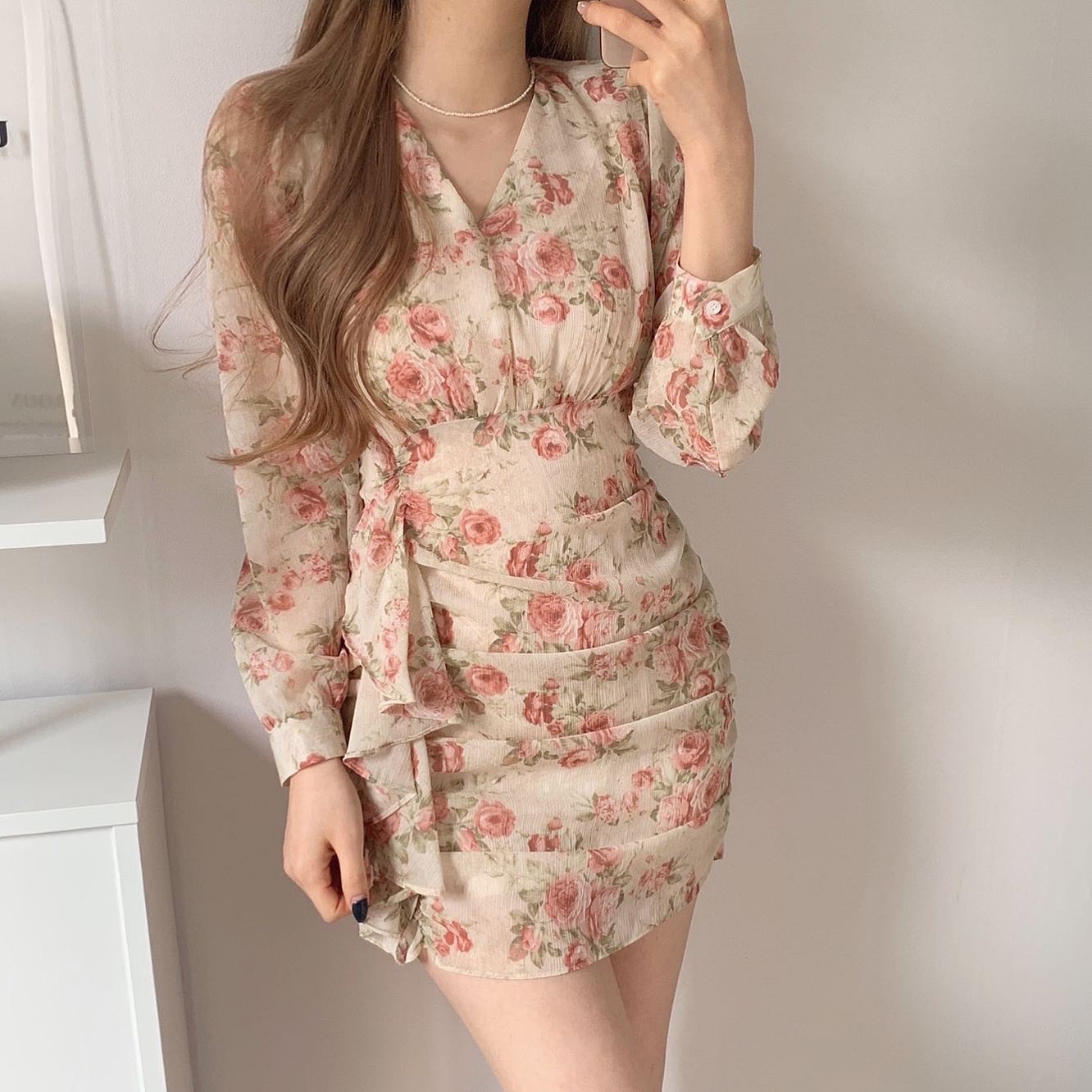 [ 국내 / 핏 보장! ] 어포인트 플라워 쉬폰 셔링 미니원피스 2color