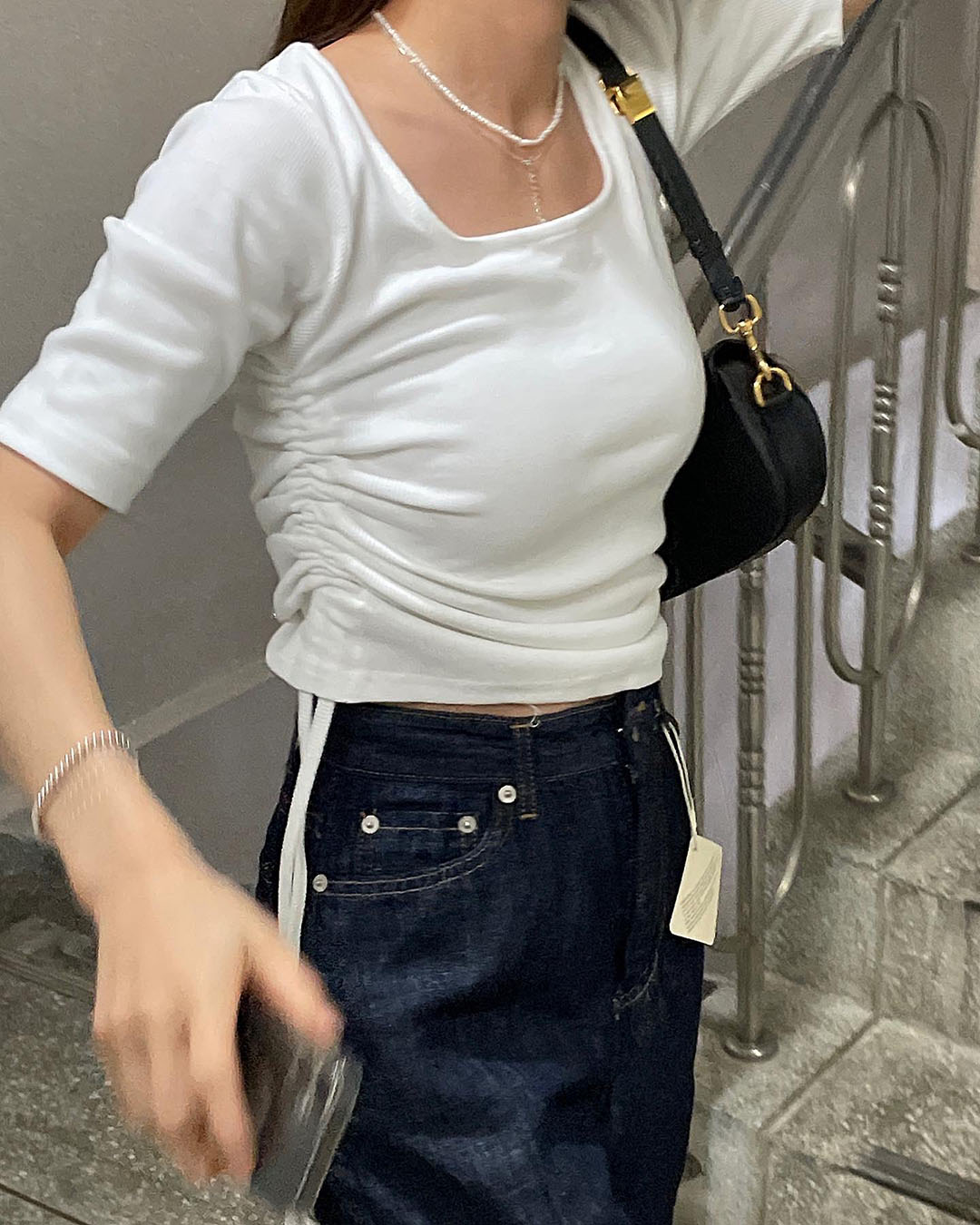 로단 여름 셔링 스퀘어넥 리본 슬림 스판 무지 레이어드 스트링 반팔 티셔츠