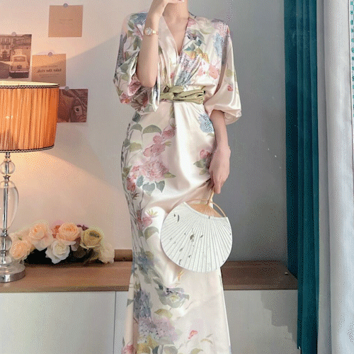 [여행/롱원피스]일본 감성 플라워 브이넥 랩원피스 썸머 홀리데이 기모노 스타일 허리 스트랩 셔링 벌룬 7부 반팔 실크 빅사이즈 꽃 원피스