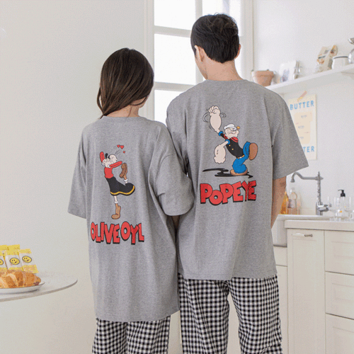 [당일출고/커플 시밀러룩] 러브 뽀빠이 올리브 반팔 티셔츠 & 올리브 원피스 잠옷