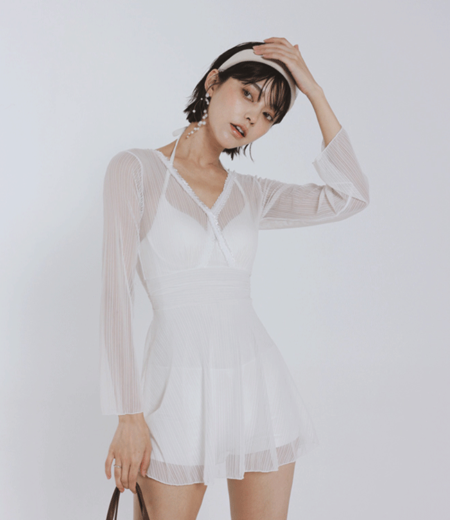 해수욕장 화이트 시스루 청순 모노키니 커버업 원피스 수영복