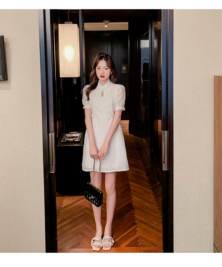 차이나카라 치파오 스타일 진주포인트 화이트 미니 원피스