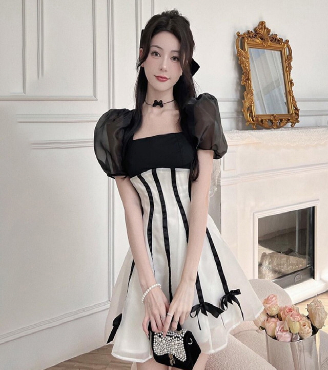 22JUN1800 여성의류 미시룩 시스루 퍼프 스트라이프 미니원피스