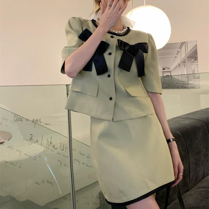 [리본 투피스 정장/하객룩 모임룩 코디]시크 모던 여름 슬림핏 일자핏 퍼프소매 라운드넥 싱글단추 프릴 가디건 자켓/배색 A라인 일자핏 미니 숏 크롭 스커트 치마/러블리 소개팅 성공 세트 코디