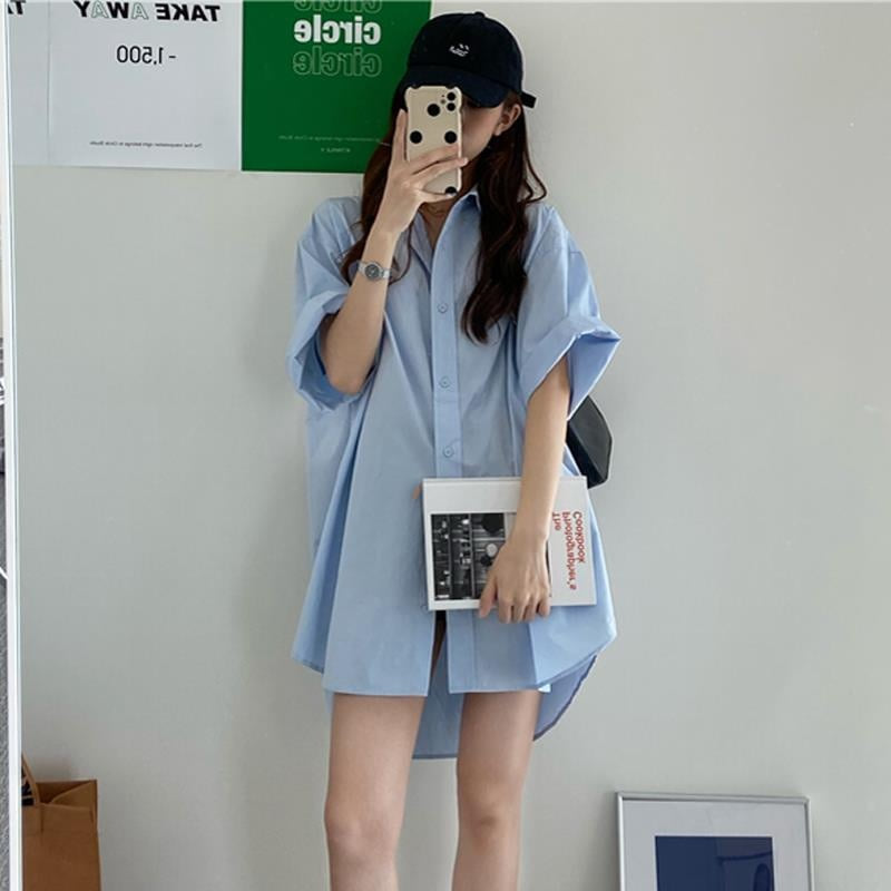 루즈핏 롱 원피스형 셔츠/남친셔츠느낌 박시한 일자핏 싱글브레스트 폴로카라 퍼플 블루 캐주얼 여름 박스 블라우스 남방/군살 몸매 커버/데일리룩 캠퍼스룩 스트릿룩 학생룩 일상룩 원마일룩 코디