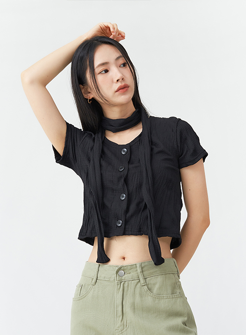 [무료배송] 링클 스카프 유넥 크롭 블라우스 U2107 (2 color)