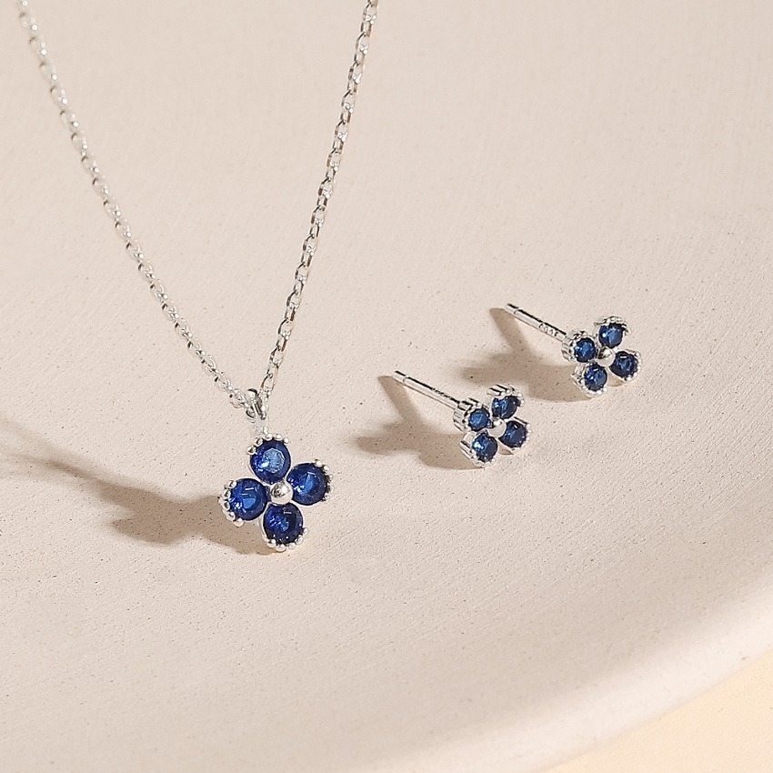 [당일] 실버925 심플 블루 사파이어 큐빅 클로버 은 귀걸이 목걸이 세트