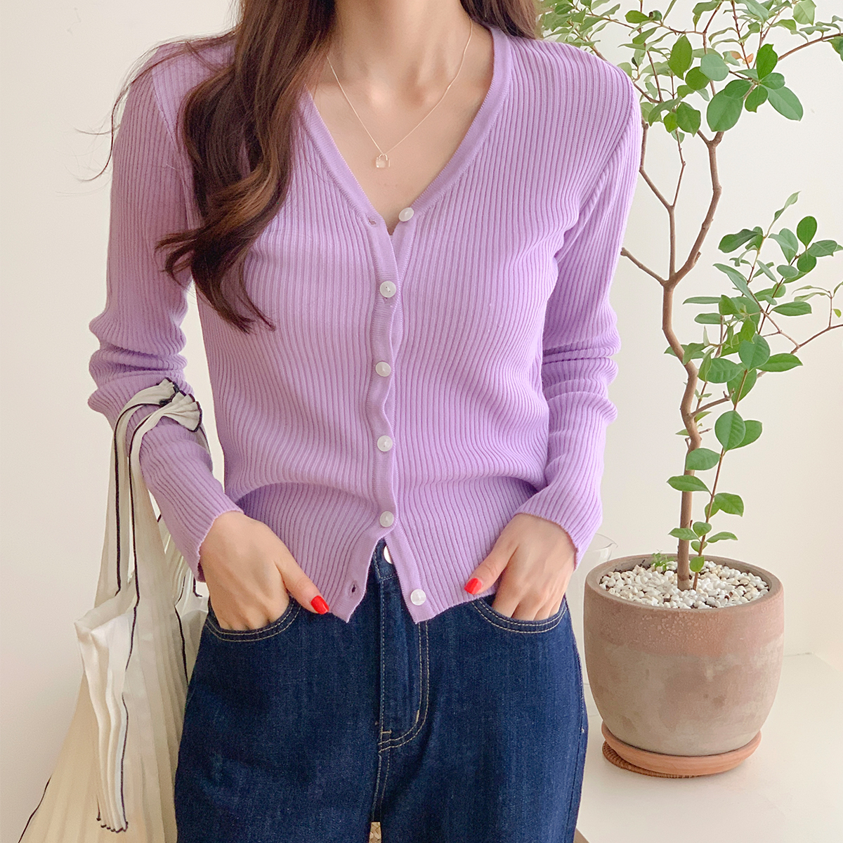 [무배] 여성 핑크 초록 브이넥 골지 가을 배색 니트 가디건 카디건