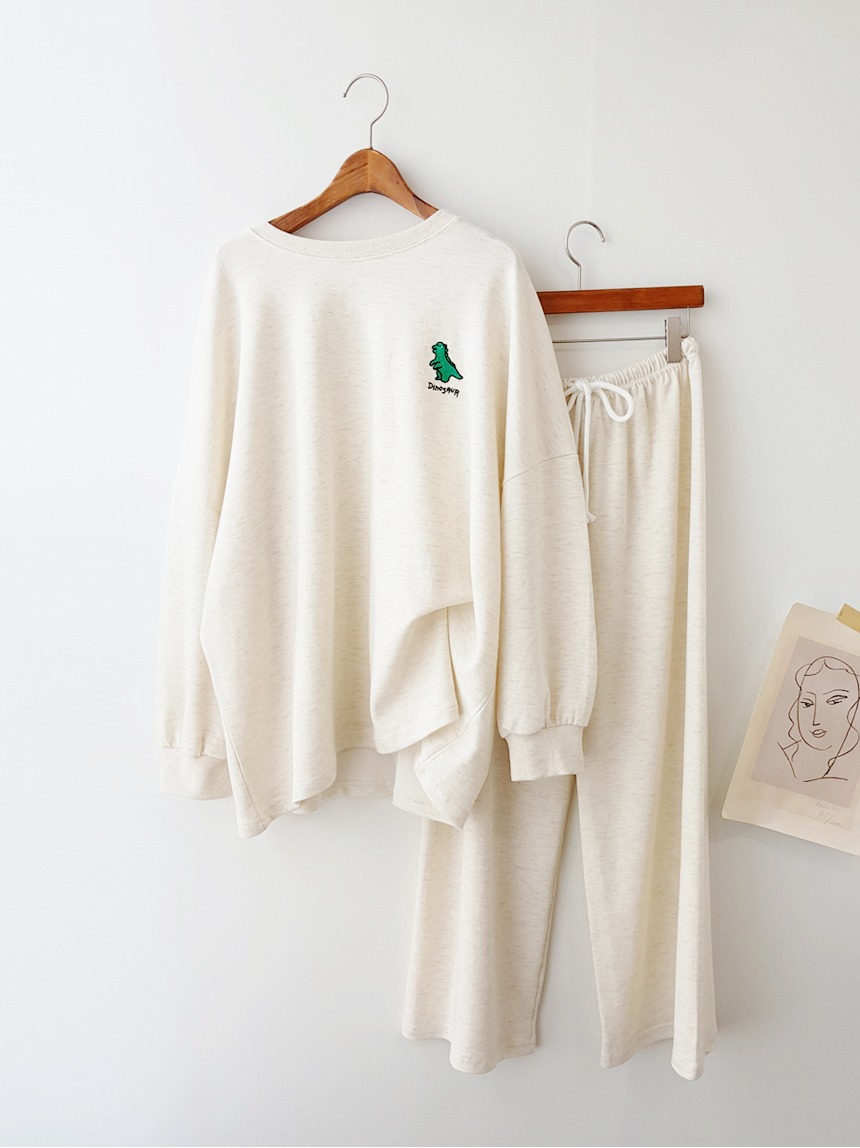 (꾸안꾸SET) 귀여운 공룡 자수 포인트 박시 루즈핏 맨투맨 티셔츠+와이드핏 밴딩팬츠 상하 바지 트레이닝복 추리닝 데일리 홈웨어 세트