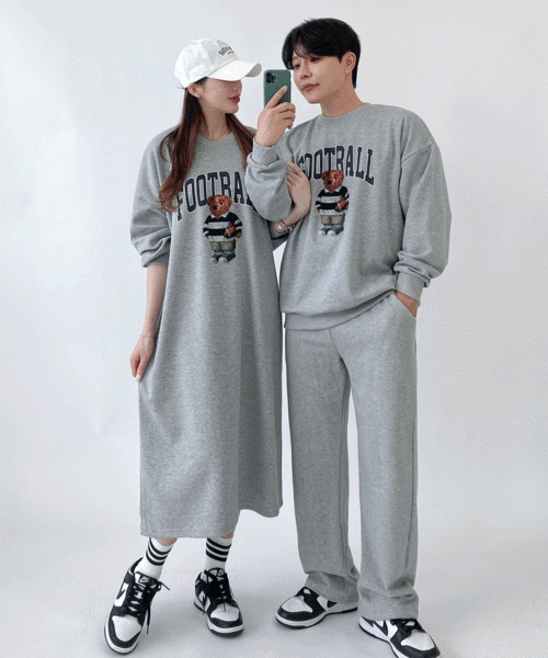 [ 기모추가 ] 커플시밀러룩 럭비 테디 곰돌이 맨투맨 후드 롱원피스 와이드팬츠 트레이닝복 5color