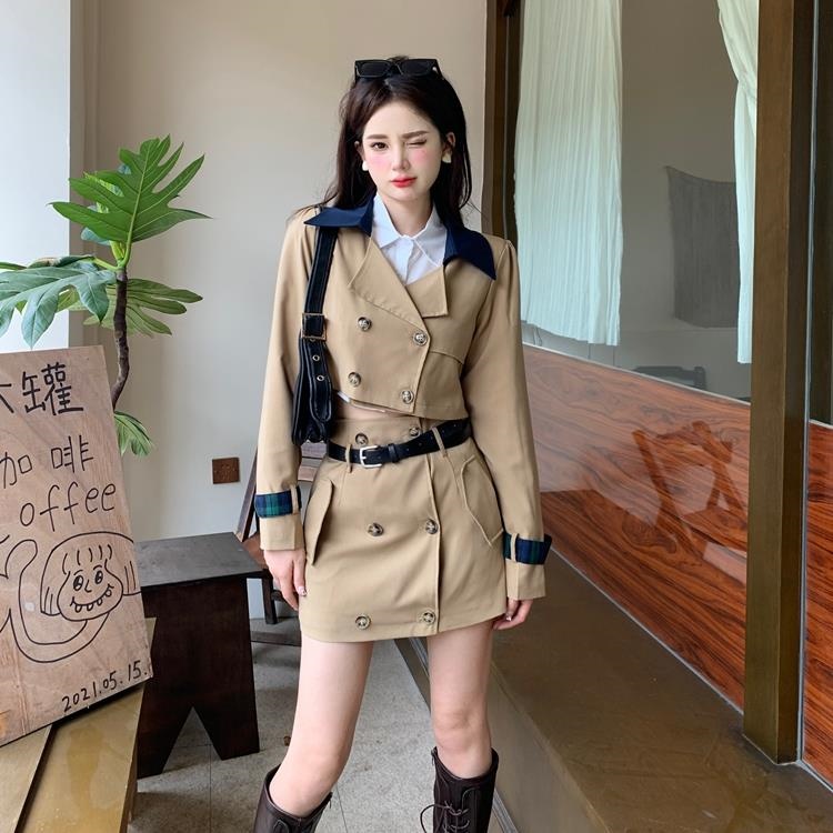 코트투피스세트/러블리 핫걸 크롭 긴팔 더블버튼 테일러드카라 그린 체크 정장 수트 트렌치 코트 자켓 봄 가을 A라인 숏 3부 짧은 미니 스커트 치마 세트 정장세트 결혼식 하객룩 모임룩 데이트룩 캠퍼스룩 캐주얼 가을 수트