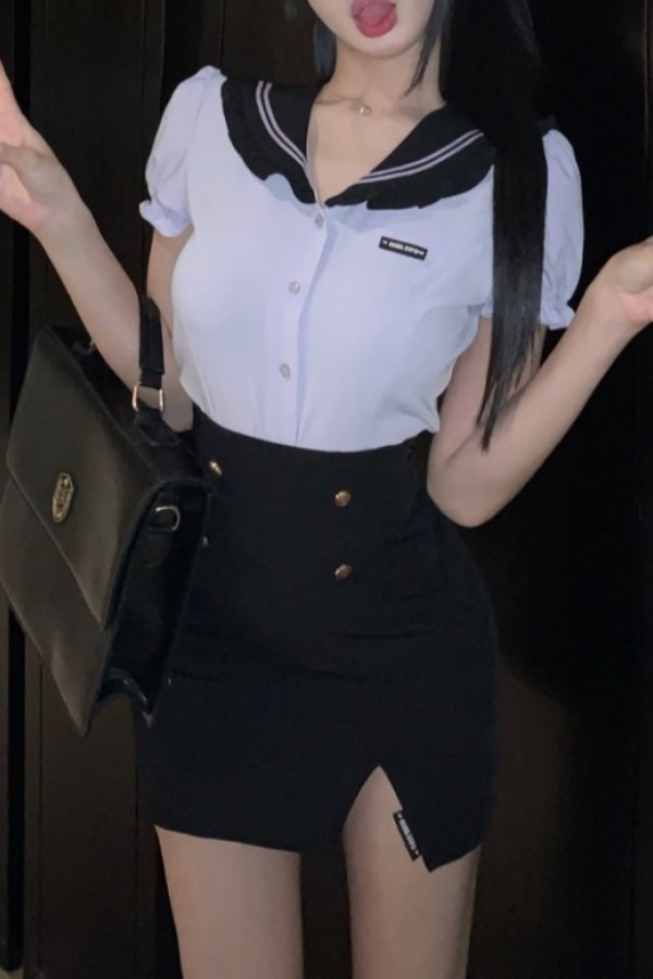 set 세일러문 카라 버블 반팔 셔츠 슬릿 미니 스커트 투피스 세트
