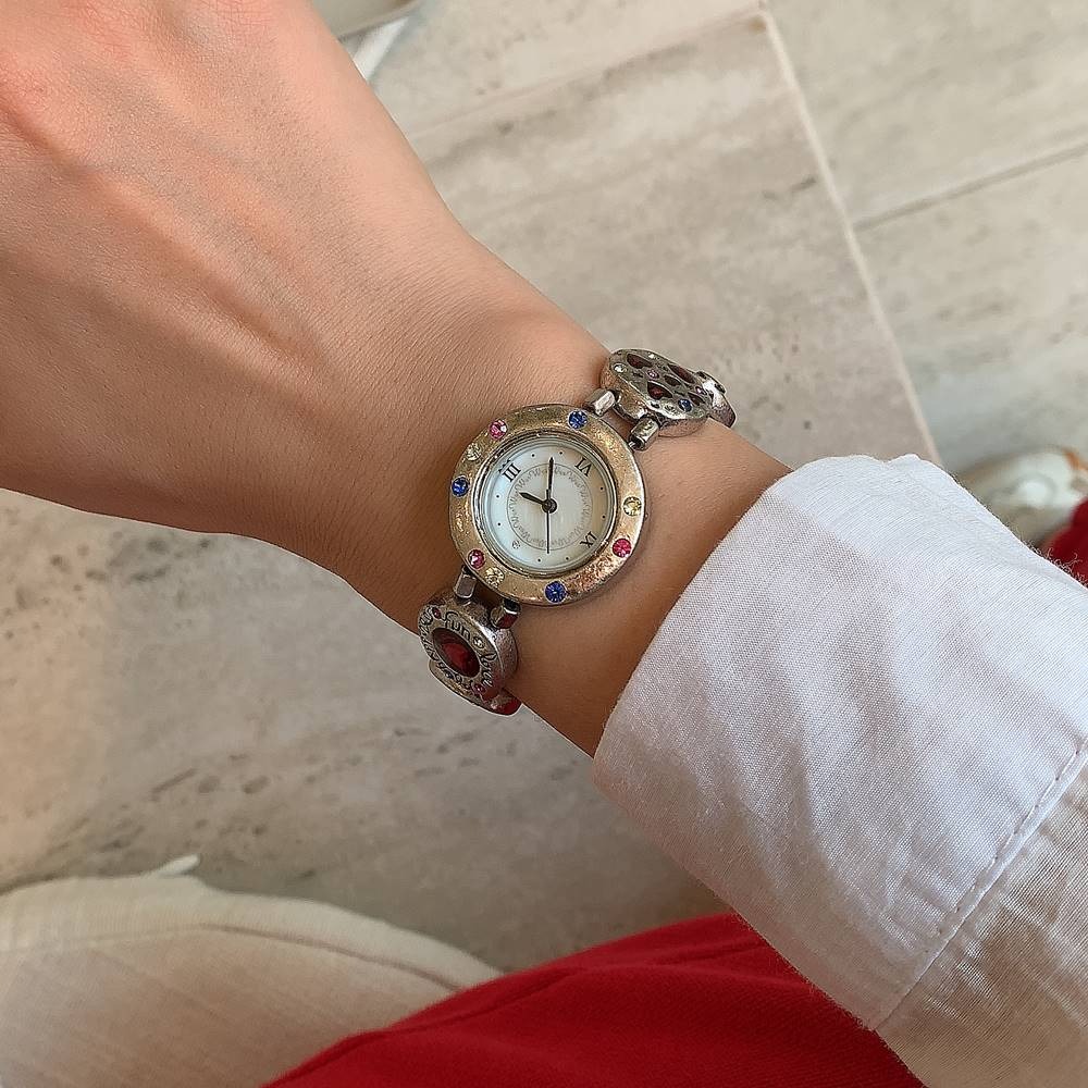 빈티지 엔틱 화려한 컬러 큐빅 볼드 메탈 여성 손목시계 팔찌