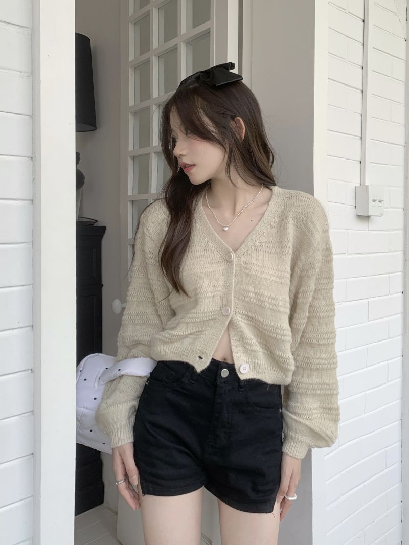V넥 솜사탕 물결 쓰리버튼 크롭 니트 가디건