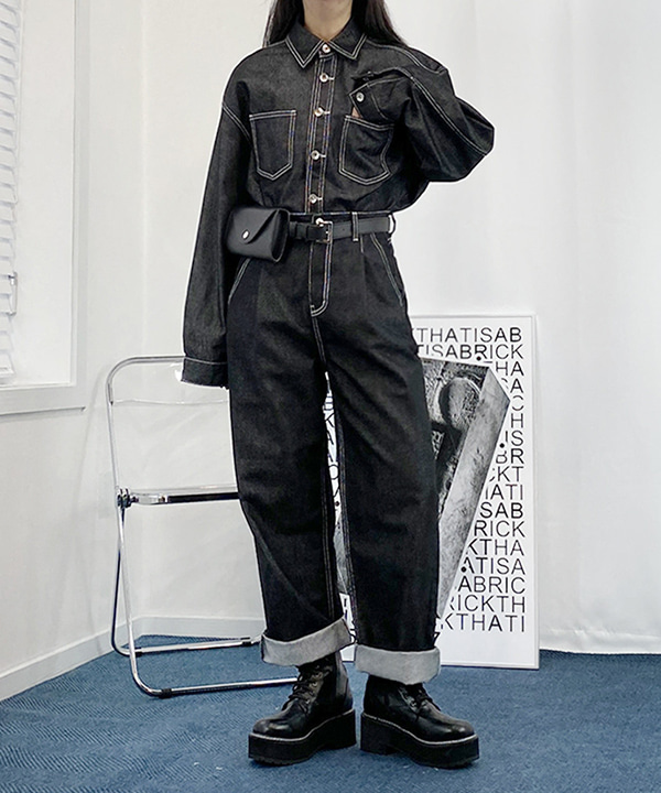 남녀공용 청청세트 가을 데님 블랙 생지 셋업 롱 와이드팬츠 자켓 투피스 데님세트 커플룩