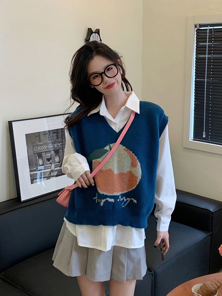 루즈핏 레이어드 화이트 셔츠/ PEAR 배 세미크롭 니트 조끼 베스트 코디세트