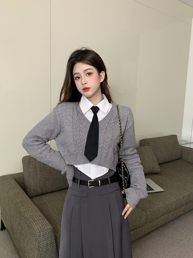 가을 졸업사진 V넥 꽈배기 패턴 나그랑 크롭 니트 + 레이어드 숏 넥타이 + 페이크포켓 플리츠 주름 벨티드 롱 스커트