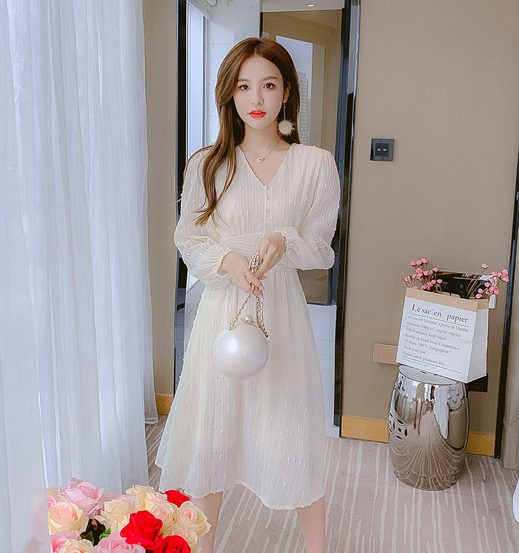 V넥 레인드랍 루즈핏 진주 단추 롱 원피스