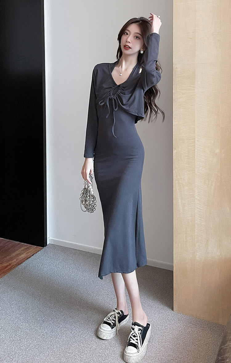 미시룩 앞트임 셔링 루즈핏 크롭 트임 T + 꾸안꾸 홀터넥 셔링 옆트임 언발란스 슬림 롱 원피스 코디세트