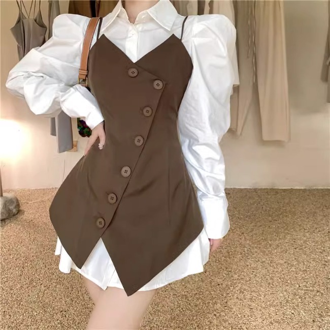 [가을하객룩] 데이트룩 모임룩 레이어드 새틴 주름 볼륨 카라 셔츠 블라우스 원피스 + 자켓형 버튼업 뷔스티에 롱조끼 베스트 세트