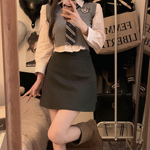 [스쿨룩/유니폼]핑크 교복셔츠 그레이 로고 숏 조끼 베스트 미니스커트 정장 치마 투피스 신상 대형 빅사이즈 3피스 놀이공원 학생 코스프레 맞춤 단체 세트 셋업