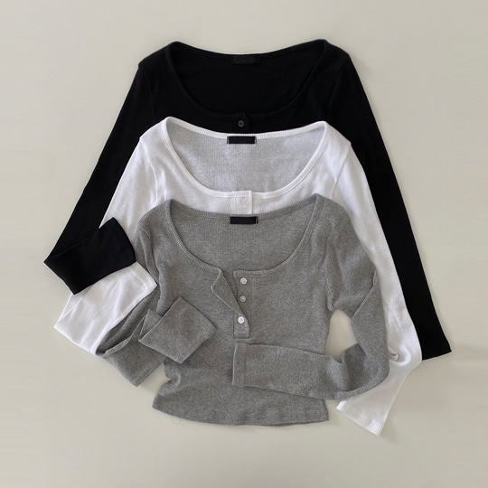 ෆ핏예쁨/3colorෆ 내 몸에 착붙핏, 여리핏 헨리넥 단추 골지 유넥 크롭 긴팔 티셔츠]에나버튼크롭
