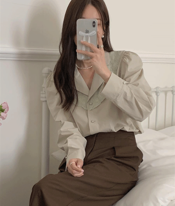 미쓰 레이스자수 브이넥 이중카라 퍼프 블라우스