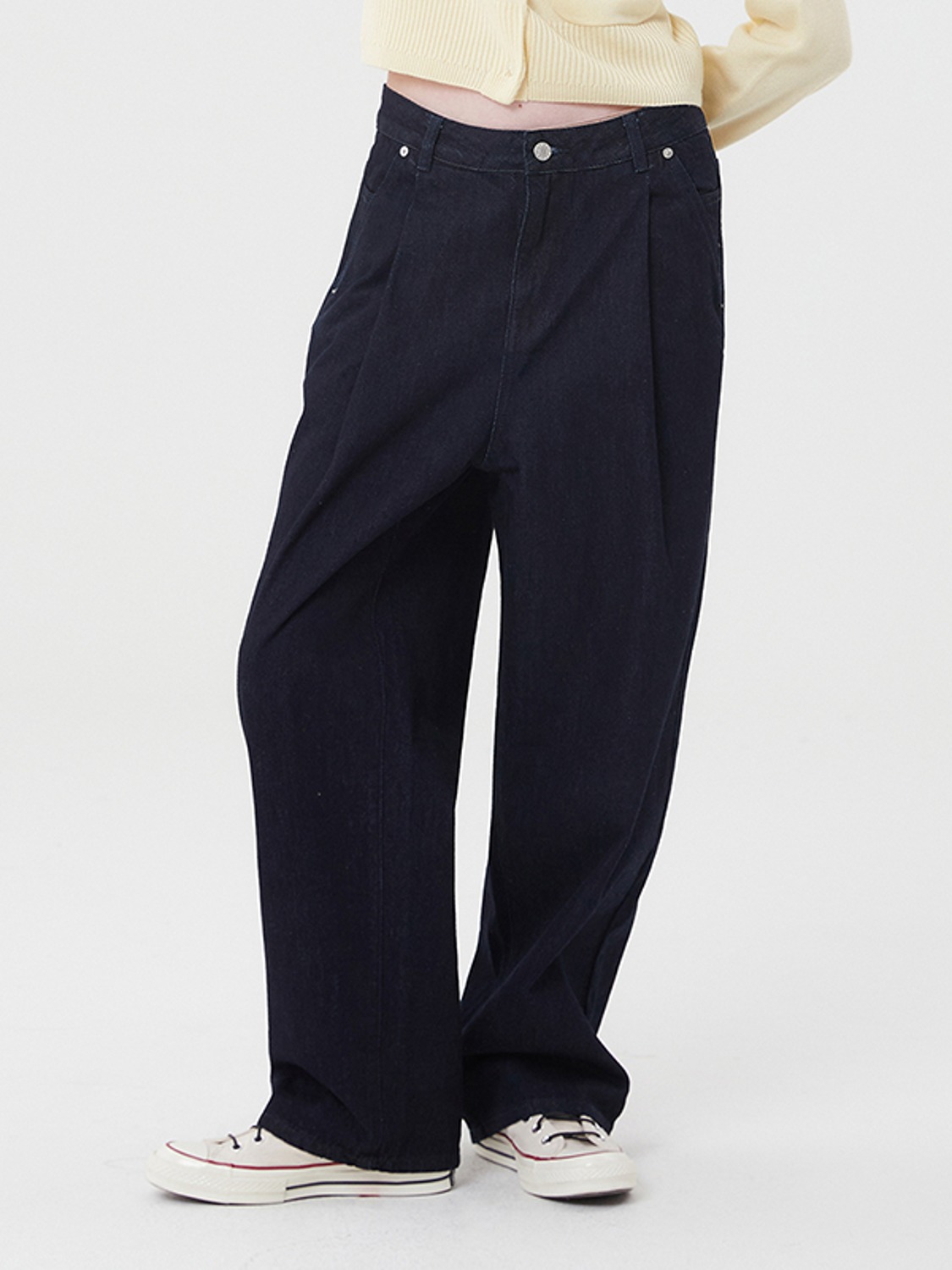 유니 투 턱 와이드 데님 팬츠 [다크 네이비]