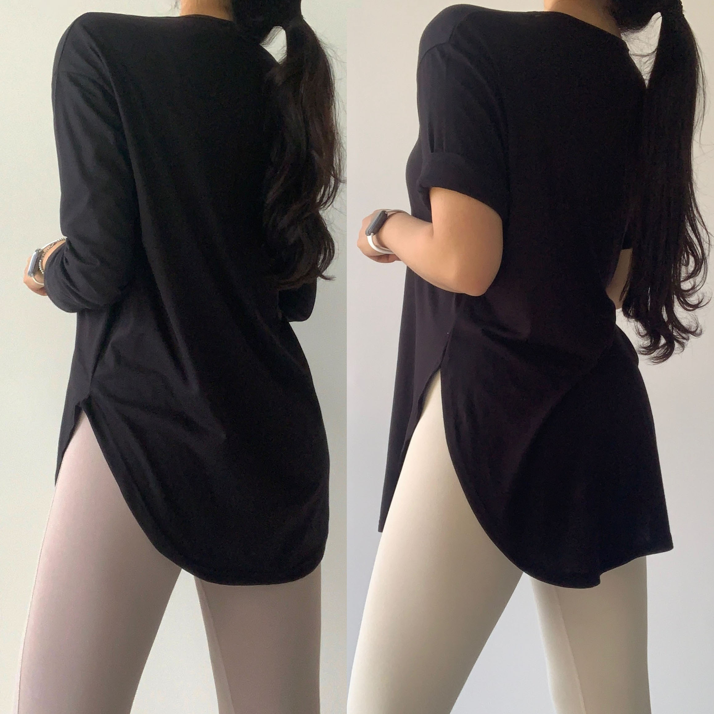 62[당일출고 MADE] 롱티 반팔/긴팔 살안타 장마룩 레이어드티셔츠 여름긴팔 커버업 브이넥반팔 힙커버 요가복 운동복 필라테스복 여리핏긴팔 롱슬리브티셔츠 무지반팔 찰랑티